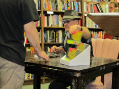 Signing books and handing out CDs.